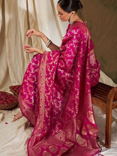 Pink Woven Floral Work Banarasi Silk Saree Set