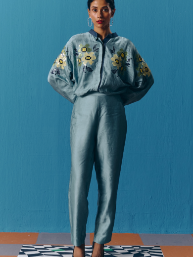 Sky Blue Silk Satin Hand Embroidered Kimono Top