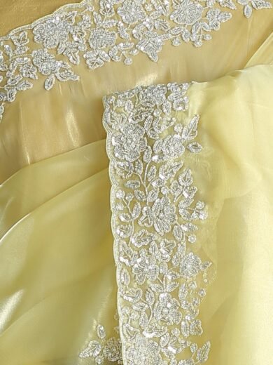 ₹1,499.00 – ₹1,699.00Price range: ₹1,499.00 through ₹1,699.00Golden Mist Yellow Sequins Embroidered Tissue Saree